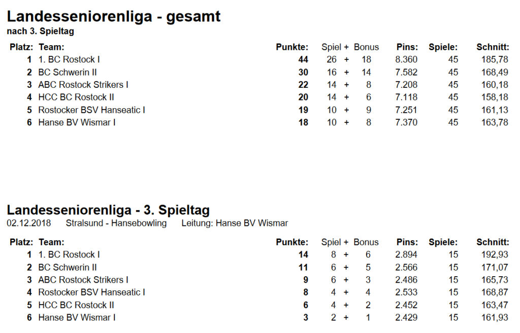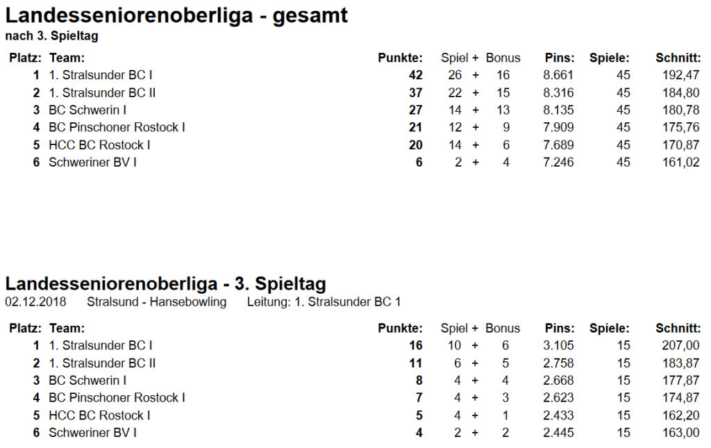 (DS/UP) Am 1. Advent fand der 3. Spieltag der Senioren, sowohl Landes- wie auch Oberliga, der Herren im Stralsunder Leuchtfeuerbowlingcenter statt. Spielte die Landesliga vormittags, so trug die Oberliga ihren Wettkampf nachmittags aus.