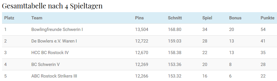 Nach der Mittagspause wurde gegen die ABC Strikers Rostock gebowlt. Der Kapitän gab die Richtung vor: sechs Spielpunkte sind Pflicht! Hieß ein Sieg musste her. Mit 624 zu 561 Pins wurde das fünfte Spiel gewonnen und vier Punkte standen zu Buche. Das letzte Spiel war ein Leerspiel ohne Gegner. Diese zwei Spielpunkte waren also sicher. Für die Mannschaft gute 3.097 Pins, ein Mannschaftsschnitt von nicht ganz 155 Pins, brachten noch zwei Bonuspunkte. Damit wurde sowohl der vierte Tabellenplatz als auch der vierte Tageswertungsplatz erreicht. Der Kapitän war mit einem sehr guten Tagesschnitt von 196,4 Pins ein Vorbild für ihre Mannschaft und verteidigte damit auch die Führung in der Rangliste der Bezirksliga.