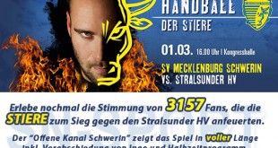 SN-SPORT war mit der Kamera beim Spiel Mecklenburger Stiere vs. Stralsunder HV am 01.03.2015 in der Kongresshalle dabei. Der Offene Kanal Schwerin sendet am 12./15.03.2015 um je 15:00, 18:00, 21:00 und 00:00 das komplette Spiel auf unserer Aufzeichnung.
