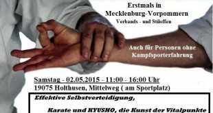 Lehrgang der Extraklasse zum „Einjährigen“ Jubiläum Der Verein feiert sein einjähriges Bestehen und bekommt Besuch vom Bundestrainer Jörg Uretschläger. Dieser richtet dann am 02.05.2015 in der Sporthalle Holthusen zusammen mit Bushido Pampow einen Lehrgang der Extraklasse im Bereich Selbstverteidigung aus. Karate vs. Kyusho…die geheimen Techniken der Druck- und Vitalpunkte. Kyusho …