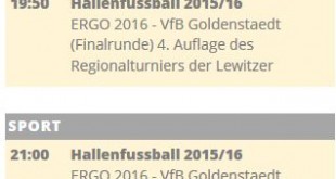 Donnerstag und Sonntag sendet der offene Kanal Schwerin unseren Mitschnitt vom ERGO-CUP 2016 des VfB Goldenstädt. (Sie empfangen Fernsehen in Schwerin in den Kabelnetzen von Kabel Deutschland in Schwerin, Gadebusch und Parchim, außerdem im Schweriner Kabelnetz des Unternehmens WTC (Wohnen- & TeleCommunication) auf Kanal 67 täglich von 00.00 bis 24.00 …