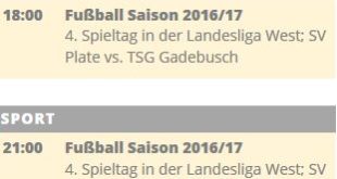 Diese Woche sendet Fernsehen in Schwerin unseren Mitschnitt vom Landesligaspiel SV Plate vs. TSG Gadebusch. Sendezeiten beziehen sich auf Donnerstag und Sonntag.