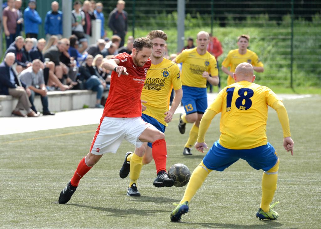 Doch das ging anfänglich nicht ganz auf, denn es dauerte bis zur 25. Minute bevor Andre Wenzel die Führung erzielen konnte. Bis zu diesem Zeitpunkt standen die Hausherren in der Abwehr sehr stabil und waren kämpferisch sehr stark. Sie machten die Räume sehr eng und das Ankerteam versäumte es, mit gefährlichen Situationen über die Flügel Gefahr in den SSC-Strafraum zu bringen. Trotzdem hatten Sebastian Schiewe, Kevin Mbengani und Lucas Vierling mit einem Kopfball bereits vorher gute Einschussmöglichkeiten. So konnten die Gastgeber mit dem 0:3-Pausenstand noch sehr zufrieden sein.