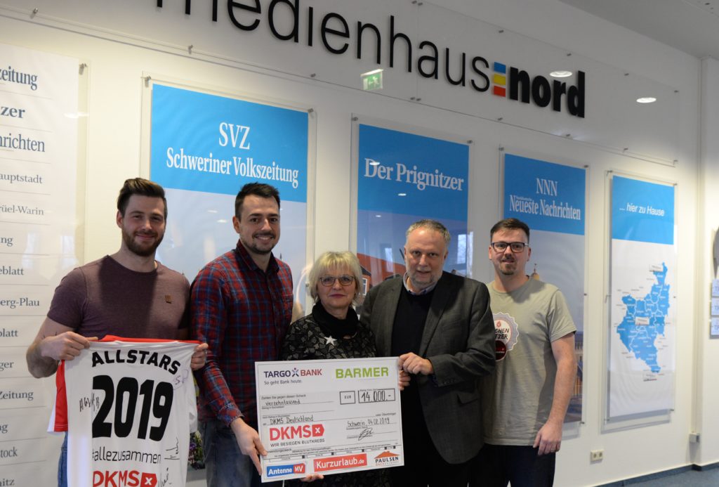 Neun Tage nach dem Event trafen sich Organisator Steffen Klatt sowie Bernd Schulte (Landespressesprecher der BARMER) und übergaben Rita Martens, ehrenamtliche Helferin der DKMS Deutsche Knochenmarkspenderdatei im medienhaus:nord Schwerin die Spende. „Wir haben uns auch für die vierte Auflage das Ziel gesetzt, den Vorjahreserlös zu übertreffen und erstmalig fünfstellig zu werden. Mit Hilfe aller teilnehmenden Vereine, Zuschauer und Partner konnten wir das Ziel erreichen, gar übertreffen“, freute sich Klatt bei der Spendenübergabe. Zusätzlich wurde das Turnier durch die Ehrenamtsstiftung M-V gefördert.
