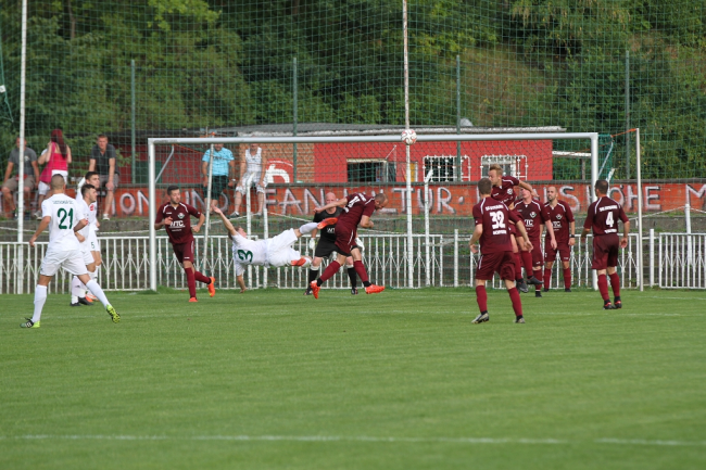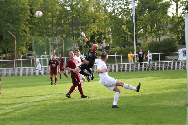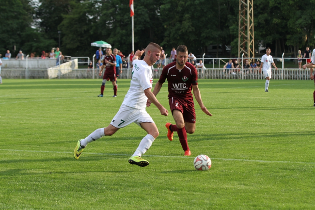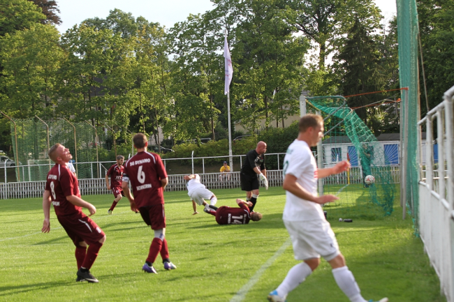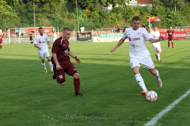 Von Beginn an stellte sich die SG Dynamo Schwerin hinten rein und lauerte auf Konter über Maik Kochan und den starken Nico Leistikow. Der Güstrower SC spielte zunächst abwartend, um dann stetig das Tempo zu steigern. In der 13. Minute versuchte es der Güstrower SC erstmals mit einem Distanzschuss. Der Schuss von Nico Hinrichs ging weit rechts vorbei. Nur eine Minute später hatte Dynamo Schwerin seinen ersten und einzigen Torschuss des Spiels. Den Distanzschuss von Maik Kochan hielt Florian Kirsch im Nachfassen. Nach einer Flanke köpfte Güstrows Torjäger Björn Plate links vorbei. Nur eine Minute später wurde ein Güstrower Distanzschuss unglücklich vor die Füße von Björn Plate abgewehrt und diesmal ließ er sich nicht zweimal bitten und schob den Ball überlegt zum 0:1 ins lange Eck. Nach einem Freistoß in der 20. Minute köpfte der aufgerückte Innenverteidiger Marvin Bartelt über das Tor. Ein Distanzschuss von Sven Bildhauer ging in der 22. Minute rechts vorbei. Der Distanzschuss von Sava-Andre Mihajlovic, Dreh- und Angelpunkt im Mittelfeld des Güstrower SC, ging in der 24. Minute über das Fangnetz. Güstrows Innenverteidiger Marvin Bartelt war in der 26. Minute wieder mit aufgerückt, sein Distanzschuss ging knapp links vorbei. Bei einem Freistoß von Sava-Andre Mihajlovic in der 28. Minute zeigte Daniel Leistikow erstmals seine ganze Klasse und lenkte den Ball zur Ecke. Auch Güstrows Philipp Scheller brachte es in der 34. Minute mit seinem Distanzschuss fertig über das Fangnetz zu schießen. Nur eine Minute später erzielte Björn Plate, nach schönem Pass in den Lauf von Philipp Scheller, die 0:2 Führung. Wiederum nur eine Minute später lief der Güstrower SC einen Konter und nach einer Flanke von Björn Plate erzielte Güstrows zweiter Stürmer Philipp Keup das 0:3. Philipp Scheller versuchte es in der 38. Minute nochmal aus der Distanz. Sein Schuss traf aber nur den rechten Außenpfosten und so ging es mit 0:3 in die Kabinen.