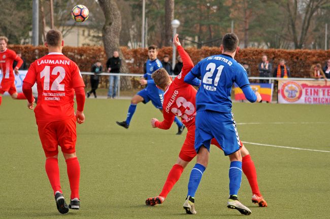 Im ersten Auswärtsspiel der Rückrunde zeigten die Schweriner eine couragierte Leistung, belohnten sich am Ende allerdings für den Aufwand nicht. Da der Hautplatz gesperrt wurde, obwohl dieser einen guten Eindruck machte, hieß es auf Kunstrasen zu spielen. Vor dem Spiel warnte Trainer Enrico Neitzel seine Mannen, dass die Berliner sehr aggressiv und pressend das Spiel beginnen werden. Schließlich war es das erste Match unter dem neuen Trainergespann Arsovic/Pocrnic.