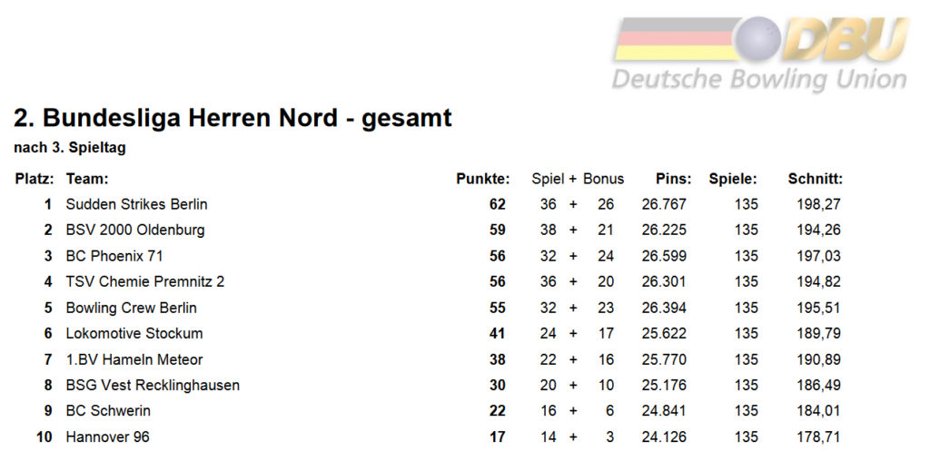 Halbzeit in der 2. Bundesliga Nord der Herren im Bowling