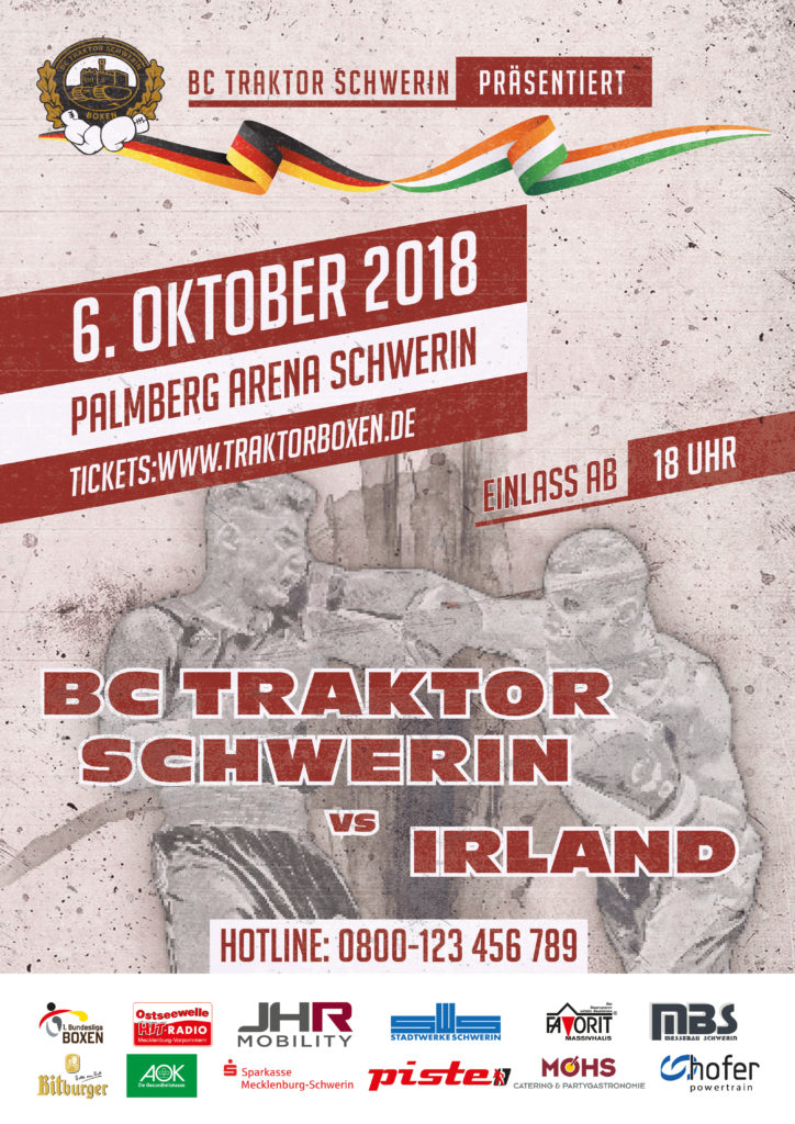 Am Samstag, den 06.10.2018, kommt es in der Palmberg Arena Schwerin zum ersten Show-Down nach dem Wiedereinstieg des Boxclub Traktor in der 1. Box-Bundesliga. Denn dann erwarten die Boxfans im Norden ein Kampf der Extra-Klasse. Die TraktorBoxer treten gegen die schlagstarken Iren in 12 angesetzten Kämpfen an. Das Aufgebot von der Grünen Insel kann sich sehen lassen, denn die Staffel reist gleich mit acht nationalen Champions nach Schwerin. Unter ihnen u.a. der EM Bronzemedaillen Gewinner Dean Walsch (69 kg), U19 Vize-Europameister Frankie Cleary (60 kg) sowie zweifacher Vize-Europameister Barry McReynolds (60 kg). „Boxen und Irland hat eine bekannte und erfolgreiche Historie. Sie sind technisch gut ausgebildet und bekannt für ihren Kampfgeist bis zur letzten Sekunde. Wir erwarten einen heißen Tanz im Oktober, dem wir uns stellen wollen. Unsere Männer sind heiß und keiner von Ihnen will vor heimischen Publikum Punkte lassen.“, so Liga-Coach Sebastian Zbik. Auch das Traktor Team hat einiges in der Hinterhand. Arian Cekicaj, der dreifache Deutsche Meister im Nachwuchs, wird seinen ersten Männerkampf vor heimischen Publikum absolvieren. Er soll auch in der kommenden Saison in der Gewichtsklasse bis 57 kg starten. Des Weiteren sollen Kevin Boayke (75 kg) und Brian Hellwig (81 kg) zum Zuge kommen. Für Unterhaltung sorgen sicherlich auch wieder die Finnen Arslan Khataev und Keni Aliu, die in Schwerin schon sehenswerte und siegreiche Kämpfe ablieferten. Verstärken sollen ebenfalls zwei Neuzugänge, die am 06.10. präsentiert werden. Für nur 10,00 € zzgl. Gebühr erhält man ein Eventticket im Vorverkauf. Tickets sind hier erhältlich: www.traktorboxen.de Ticket-Hotline: 0341-33173633