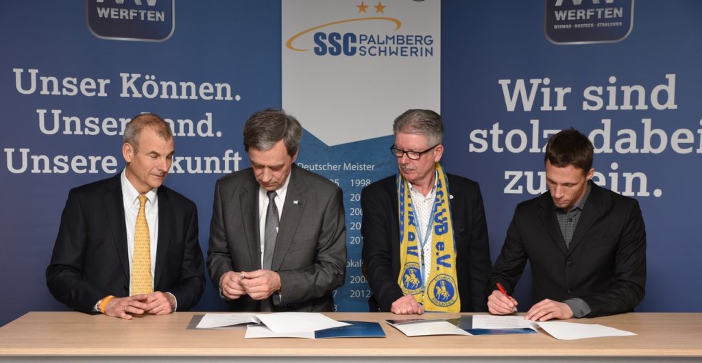 Ein entsprechender Vertrag wurde am 1. März, direkt nach dem letzten Heimspiel der Hauptrunde der Saison 2016/17, von den MV-WERFTEN-Geschäftsführern Jarmo Laakso und Richard Gruenhagen sowie SSC-Präsident Johannes Wienecke in der PALMBERG ARENA in Schwerin unterzeichnet. Das Sponsoring der Erstligamannschaft läuft für die Spielsaisons 2016/17 und 2017/18.