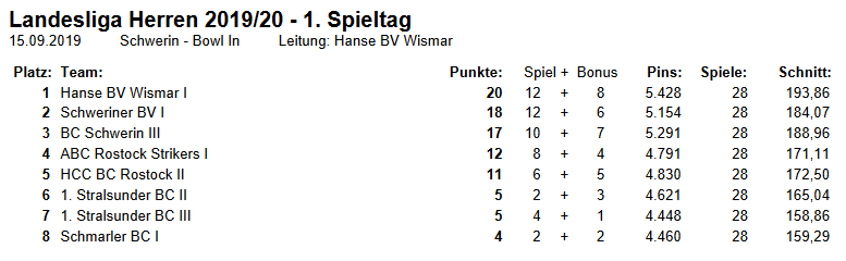 (UP) Am letzten Wochenende erfolgte nach dem Start der Oberliga auch der erste Spieltag der Landesliga der Männer im Land Mecklenburg-Vorpommern. Gebowlt wurde am 15.09. im Bowl In am Slüter Ufer in Schwerin.