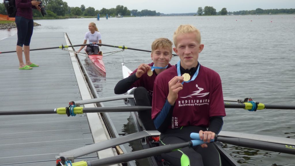 Die Schweriner Rudergesellschaft (SRG) hat bei der Deutschen Meisterschaft der Jungen und Mädchen vier Goldmedaillen errudert. Wim Ruben Lenkeit und Paul Mika Ehlke im Doppelzweier sowie Emma Kühl im Einer fuhren teilweise sogar beeindruckende Aufholjagden, um sich ganz nach vorn zu bringen. Auf der Regattastrecke in Brandenburg an der Havel holten sie vier Titel, sowohl über die Langstrecke von 3000 Metern, als auch über die 1000 Meter. Den jungen SRG-Ruderinnen und -Ruderern war anzumerken, dass sie der Ehrgeiz gepackt hatte – Wim und Mika arbeiteten sich über die 1000 Meter vom 3. Platz noch ganz nach vorn. Und auch Emma Kühl bewies besondere Regatta-Qualitäten: Als Führende hatte sie kurz vor dem 1000-Meter-Ziel eine Boje leicht touchiert, ließ sich aber trotzdem nicht aus dem Takt bringen und vor allem: von den aufrückenden Verfolgerinnen den Sieg nicht mehr nehmen.