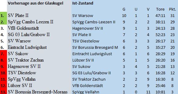 …die Überraschung: auf jeden Fall die Spitzenposition des Aufsteigers von Warsow der den Spitzenteams das fürchten lernte. Auch der zweite Aufsteiger von Bresegard konnte bisher durchaus überzeugen, genau wie die Hagenower Reserve die über sich hinaus wuchs.