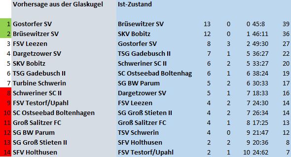 Das der Aufsteiger Brüsewitz eine gute Rolle spielen wird war uns schon klar, aber so konstant aufzutreten ist schon beachtenswert. Das die Absteiger Bobitz und Gostorf in der Spitzengruppe zu finden sind war voraus zu sehen