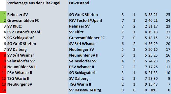 …die Überraschung in dieser Hinrunde ist zweifelsohne das Verfolgerduo auf die beiden Aufstiegsplätze. Die Reservemannschaften aus Lübstorf und Pampow überzeugten auf ganzer Linie, was man sicherlich auch über die Reserve der Dynamos von der Paulshöhe sagen kann, die Dank ihrer klugen Personalpolitik im sicheren Mittelfeld überwintern.