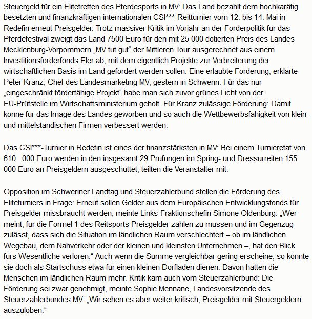 Wenn eine Landesmarketing-Firma für ein hochrangiges Reitturnier Geld ausgibt, dann erwartet diese Firma auch einen Gegenwert. Das ist Sponsoring. Und „MV tut gut“ kommt in dem Fall CSI Redefin mit seiner Bandenwerbung und Turnierberichterstattung in die Medien u.a. in Fachmagazine und über das NDR-Fernsehen und den Internetkanal clipmyhorse.de, der alle Prüfungen überträgt, zu vielen Menschen in ganz Deutschland und Europa nach Hause. Der SVZ-Mitarbeiter Torsten Roth hat hier einseitig seine persönliche Meinung dargelegt, die mit einem objektiven Journalismus nichts zu tun hat. Die Landesmarketing-Firma wie auch das internationale Reitturnier in Redefin werden von ihm verunglimpft. Hier wird dem Leser suggeriert, dass das Redefiner Reitturnier etwas Schlechtes ist und  dass Steuergelder missbraucht werden, ohne den Marketingaspekt von „MV tut gut“ und den sportlichen Wert zu sehen.