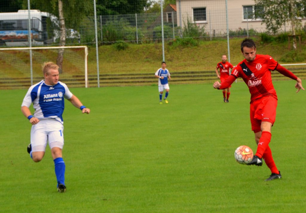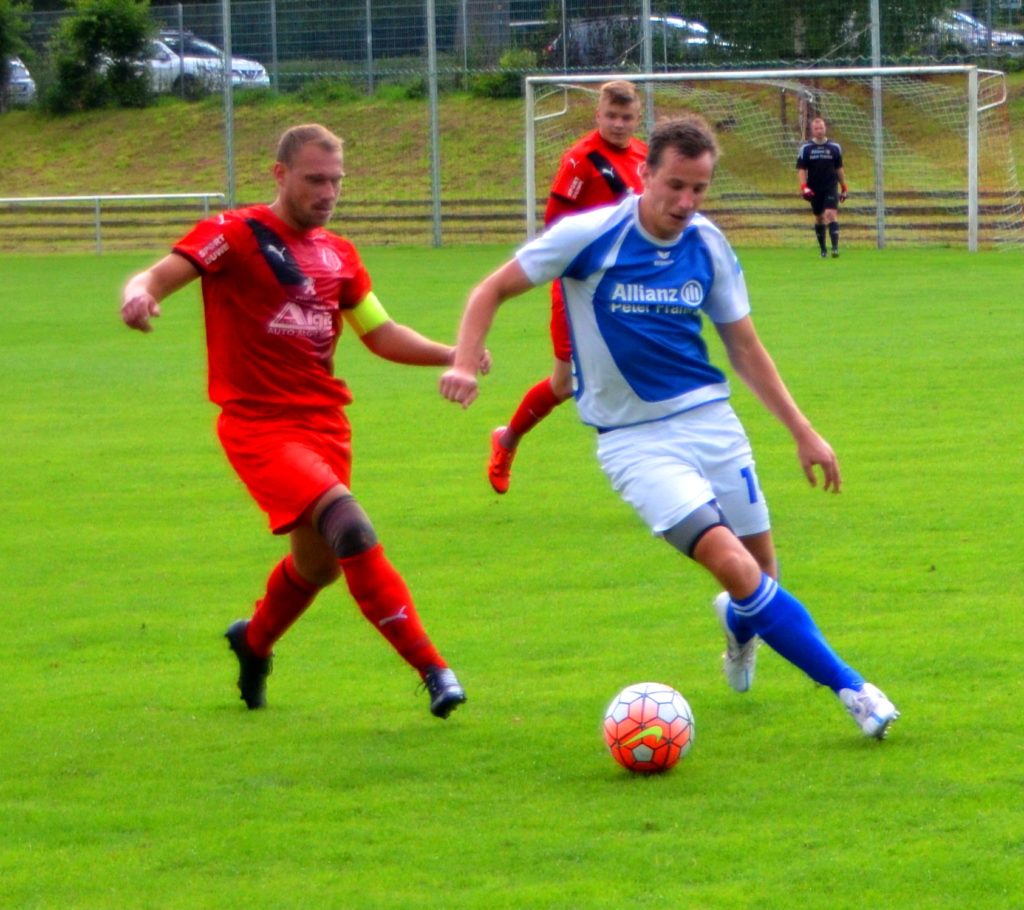 © Bernhard Knothe/der Torschütze zum 1:0, Mathias Schnöckel, im Zweikampf