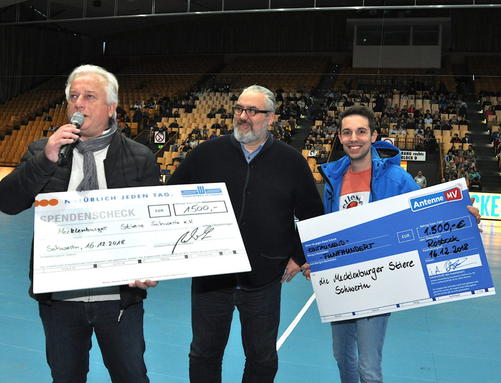 Diese Wette haben Dr. Josef Wolf, Geschäftsführer der Stadtwerke Schwerin GmbH, und Patrick Ortel von Antenne MV sicher gern verloren: Das große Derby der Mecklenburger Stiere gegen den HC Empor Rostock erlebten am Reformationstag 3560 begeisterte Zuschauer. Und damit 560 mehr als die beiden Wettpartner vorgegeben hatten. Jetzt wurde die Wette eingelöst: Dr. Josef und Patrick Ortel übergaben Spenden in Höhe von jeweils 1.500 Euro an Präsidiumsmitglied Holger Herrmann von den Mecklenburger Stieren. „Wir werden diese großartige Unterstützung zugunsten unserer erfolgreichen Jungstiere einbringen. Unser Ziel ist es, in Mecklenburg-Vorpommern die Nummer eins im Nachwuchshandball zu werden und als Landesleistungszentrum Jungs aus Schwerin und der Region noch besser fördern zu können.“ (ba)
