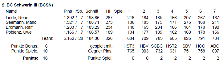 Am Ende des Spieltages standen für unsere Jungs 16 Punkte und 5.162 Gesamtpins zu buche. Damit waren die Sportfreunde Tageszweiter und auch in der Gesamttabelle konnte der zweite Platz erkämpft werden. Bester Spieler der Mannschaft war der Kapitän, René Linde, mit einem Schnitt von 198,86 Pins, das Tageshöchstspiel aller Mannschaften verzeichnete unser Sportfreund Mario Seemann mit 275 Pins für sich.