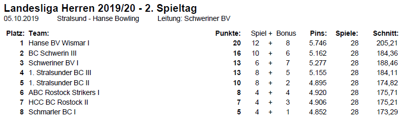 (UP) Am Sonnabend, den 05.10.2019 fand der zweite Spieltag der Landesliga im Bowling der Herren statt. Unsere Mannschaft musste leicht Ersatzgeschwächt ohne den fünften Stammspieler eine lange Reise zum Hanse-Bowlingcenter Stralsund antreten und die Erwartungen waren nicht allzu hoch!