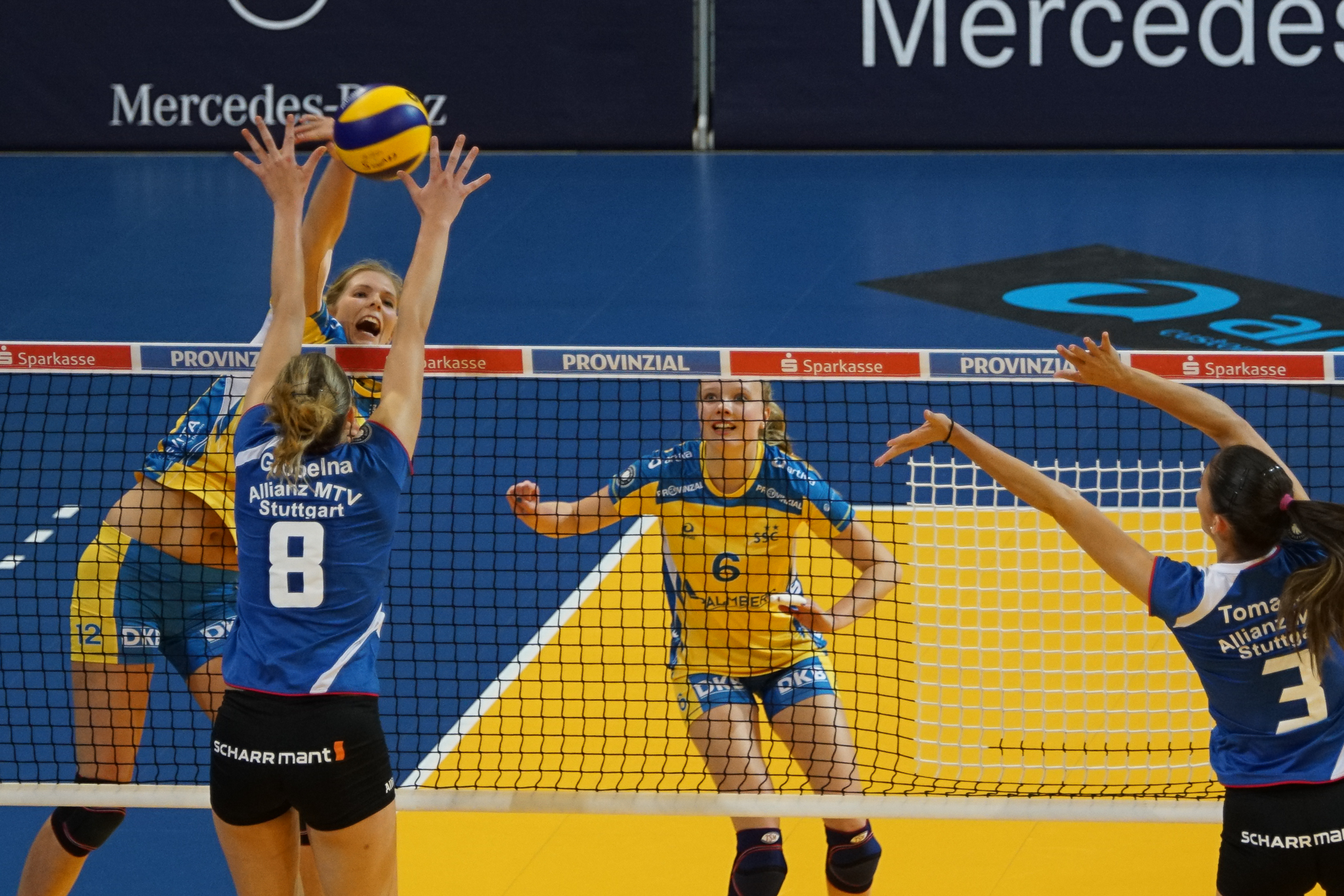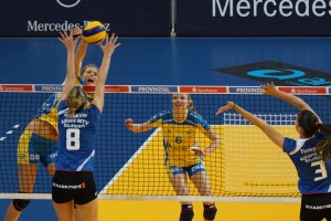 Startseite / Zwei SSC-Asse im Team für die Olympiaqualifikation / Die Schweriner Nationalspielerinnen – Anja Brandt im Angriff, Jennifer Geerties beobachtet die Situation, Foto MidiGrafie